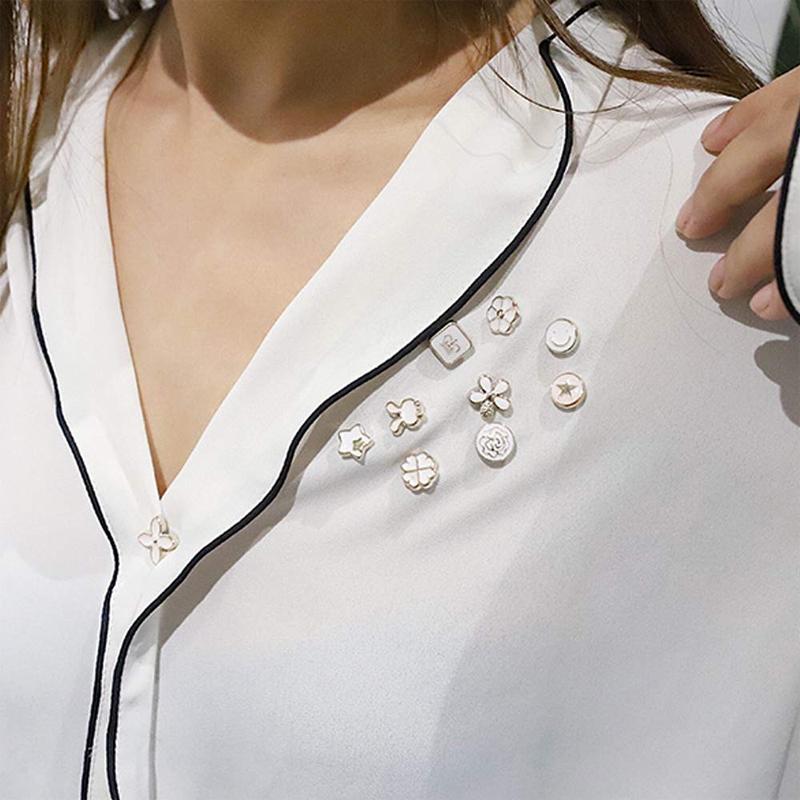 Deze set van tien stijlvolle speldjes is perfect om je blouse, jas, tas of pet een persoonlijke touch te geven. Met hun verfijnde designs en neutrale tinten voeg je moeiteloos karakter toe aan je look – van bloemvormen tot sterren en symbolen.