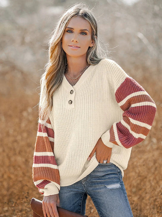 Gestreepte Damestrui Met Kabelstructuur En V-Hals – Opvallend Breisel Voor Herfst En Winter