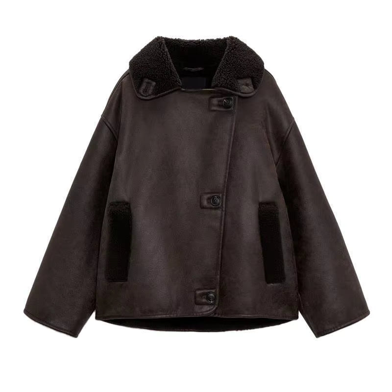 Korte Dames Teddy Jas Donkerbruin Leer