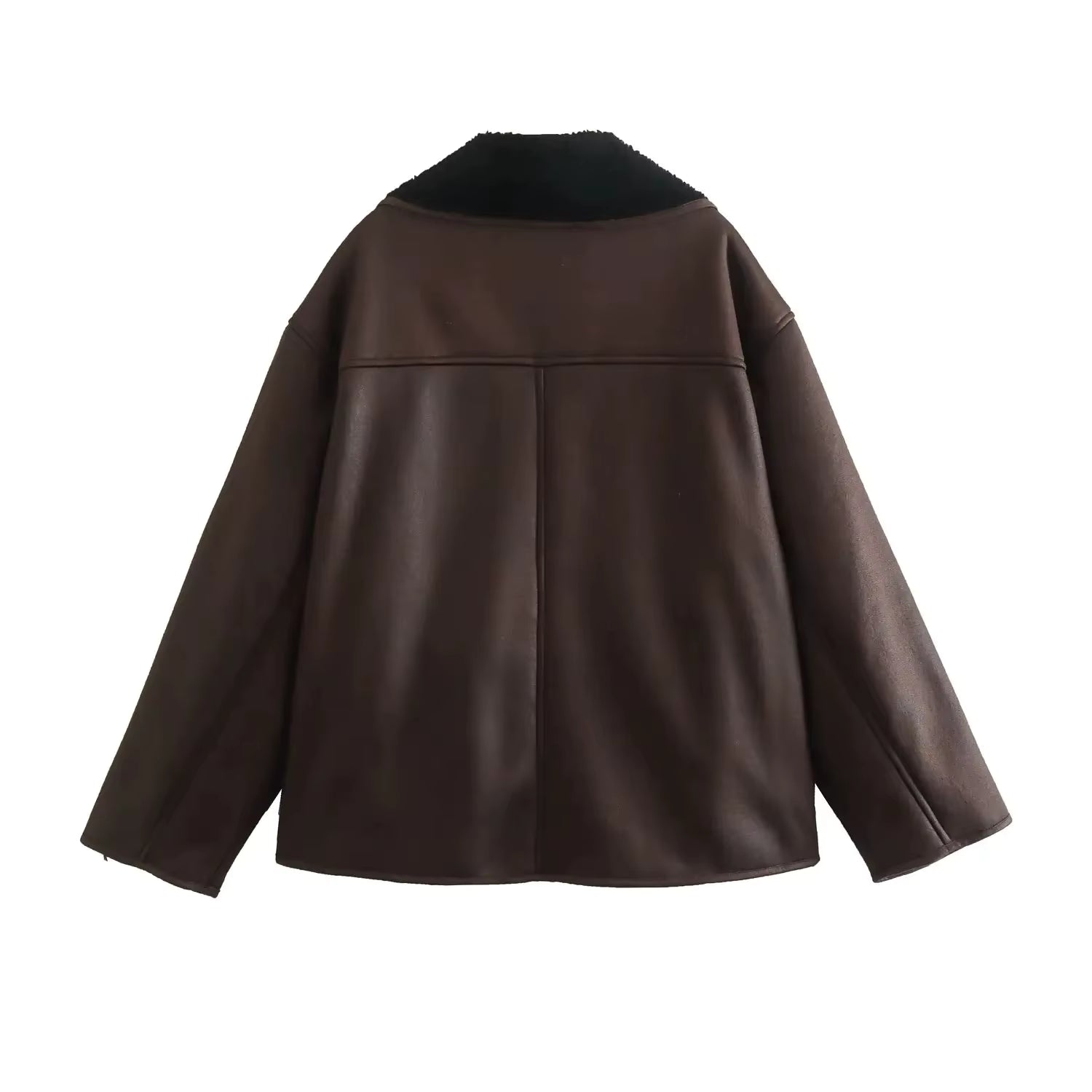 Deze korte winterjas voor dames combineert het stoere van een leren jas met het comfort van een teddy voering. De buitenzijde is uitgevoerd in donkerbruin imitatieleer met een matte, luxe afwerking. De binnenkant en kraag zijn gevoerd met zwarte teddy fleece, wat niet alleen warmte biedt maar ook een zachte, cosy look creëert.